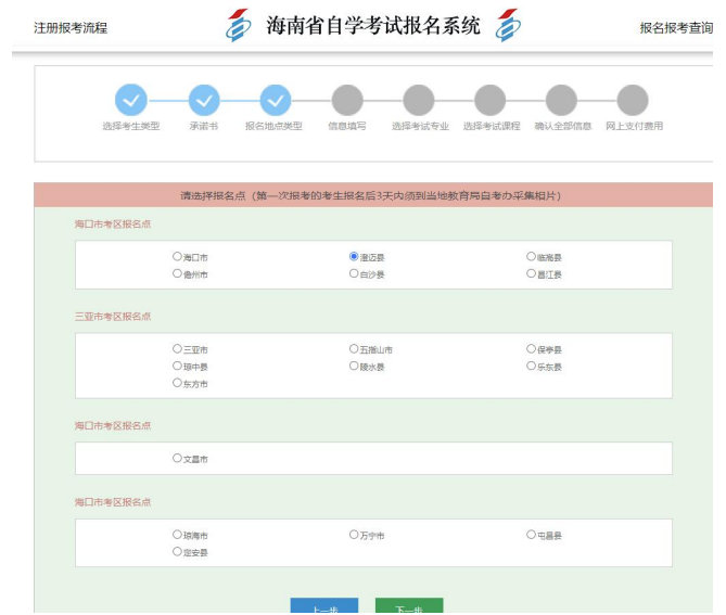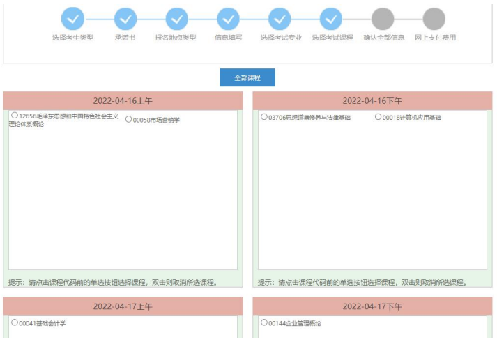 6、选择专业后,显示【选择课程】显示的是本专业下的可报考的课程,点击【全部课程】按钮后切换显示所有可报考的课程,选择报考课程后进行下一步