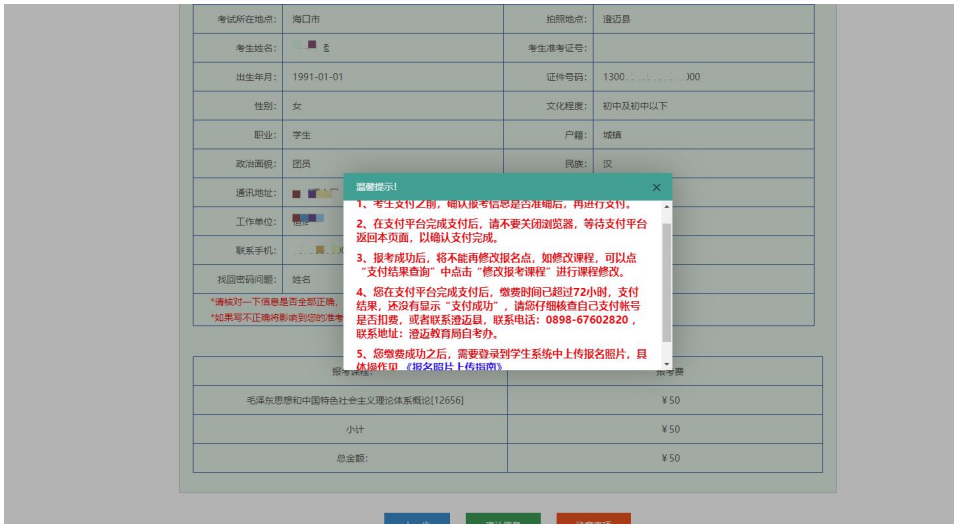 7、确认个人信息及报考信息,阅读温馨提示信息,信息确认无误后,点击【确认信息】按钮后,信息不可修改,进行下一步,网上支付