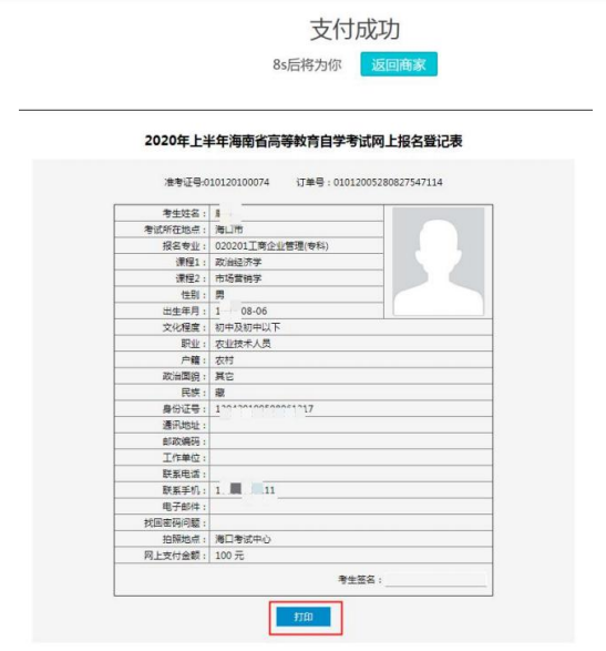 选择微信/支付宝/云闪付扫码进行支付,成功后点击返回商家或等待10 秒进入网上报名登记表打印页面,点击打印