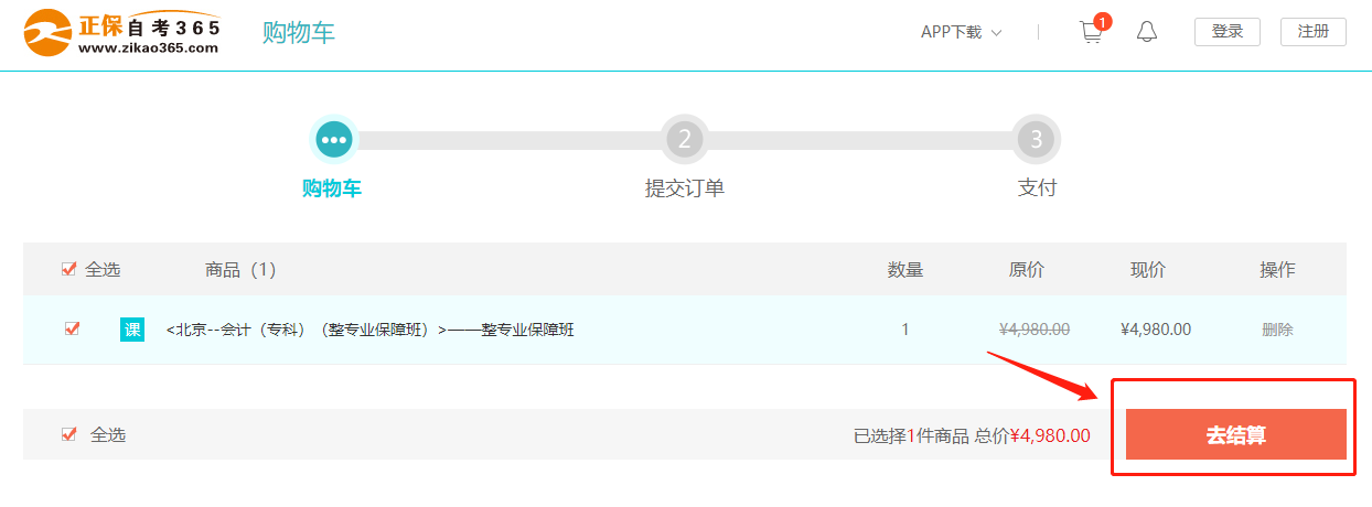 3进入购物车,确认购买课程,点击“去结算”;