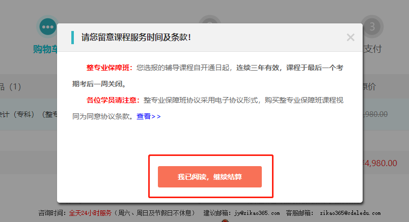 4阅读课程服务时间及条款,点击“我已阅读,继续结算”;