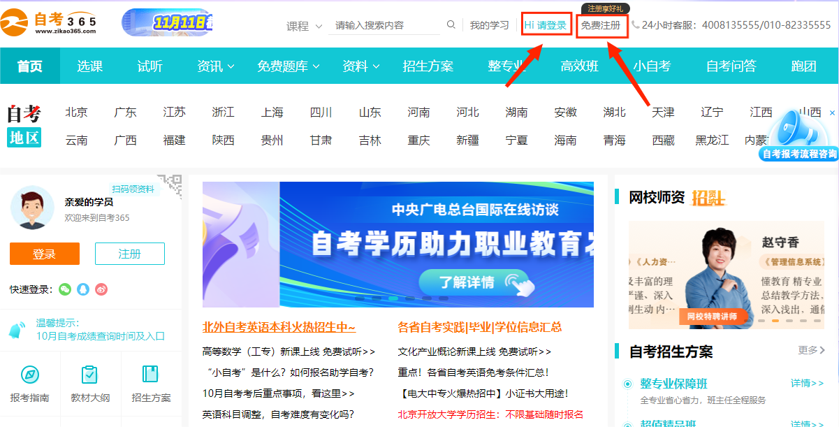 1在自考365网校网站首页,点击左上方的登录/注册按钮,弹出登录/注册弹窗;