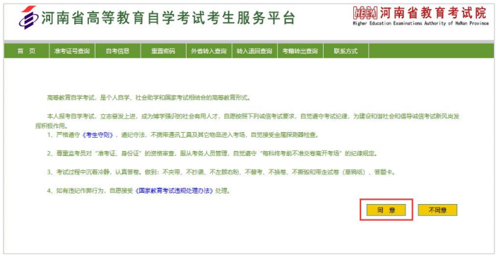3.阅读了解自学考试相关政策、规定以及《国家教育考试违规处理办法》,随后点击同意按钮。