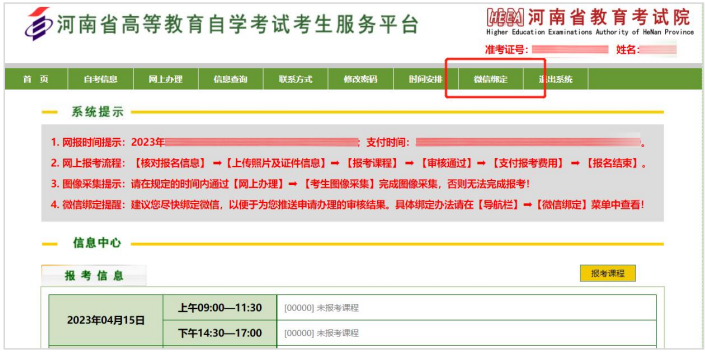 1.未绑定河南省教育考试院官方微信公众号的考生,则无法进行报考。请根据下图所示,点击微信绑定按钮。