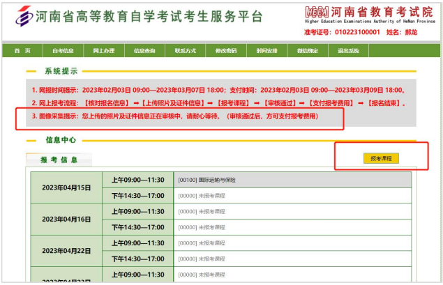 3.报考课程后,如上传的照片及证件信息正在审核中,请耐心等待审核结果。