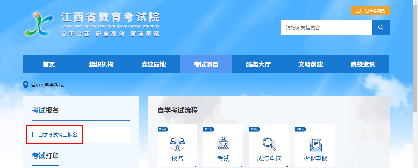 2、已注册考生登录江西省教育考试院网站进入报名入口,点击首页导航栏的“考试项目-自学考试”。