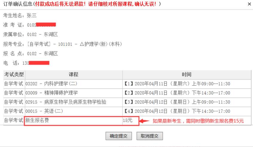 9、生成订单时,如果是新考生,需同时缴纳新生报名费用15元。