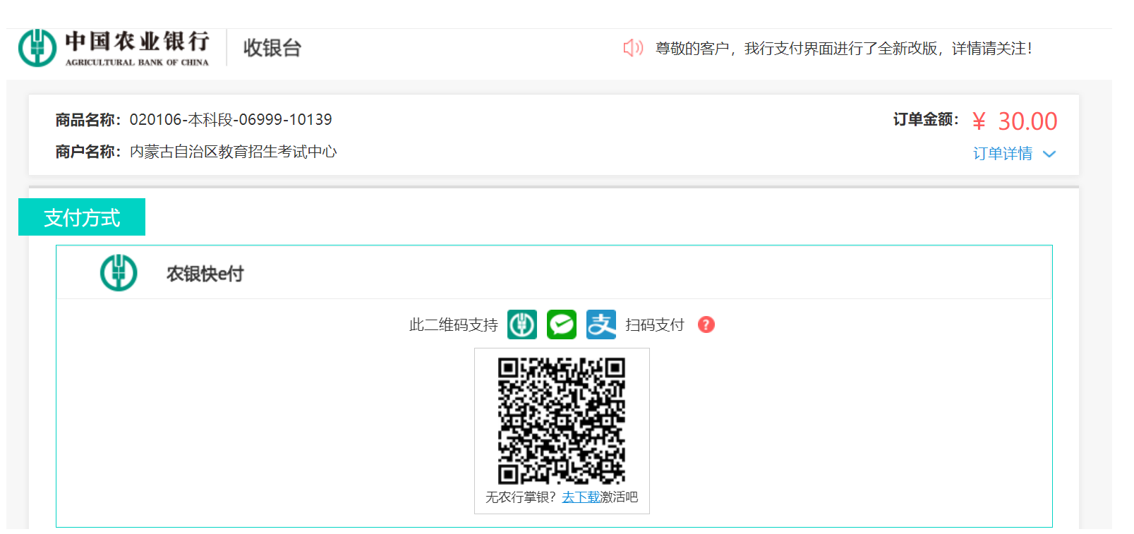 2.1扫二维码支付。此二维码支持农行掌银、微信、支付宝进行扫码支付。