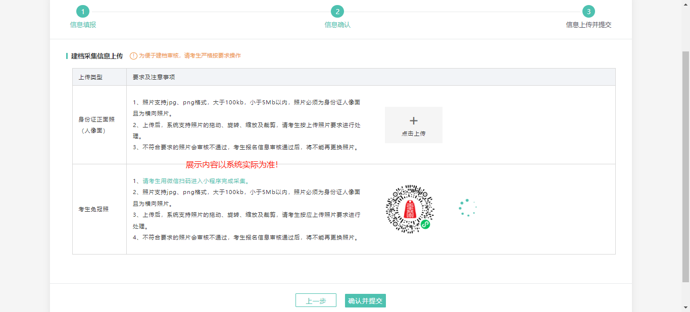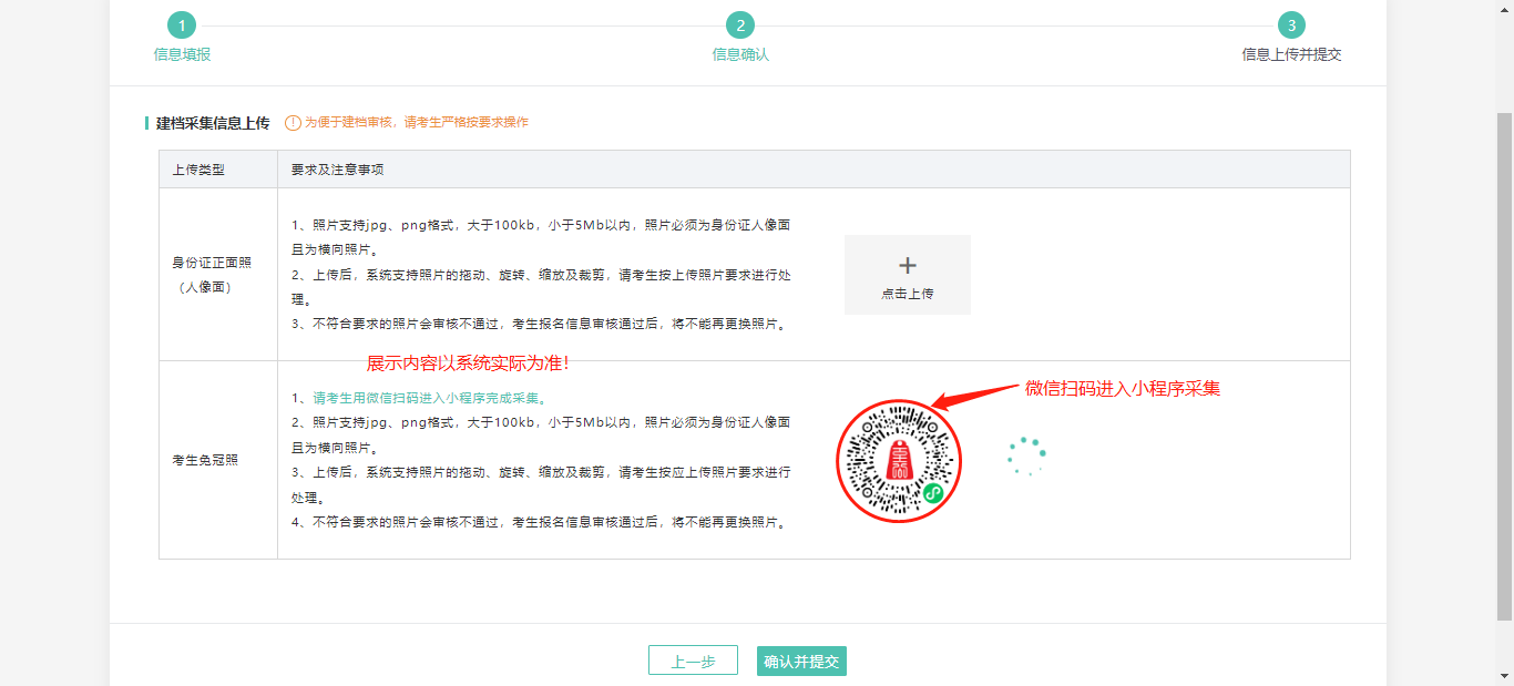 进入信息上传并提交页面后,请考生按照要求,上传身份证正面照片、使用微信扫码进入小程序完成免冠照片采集。