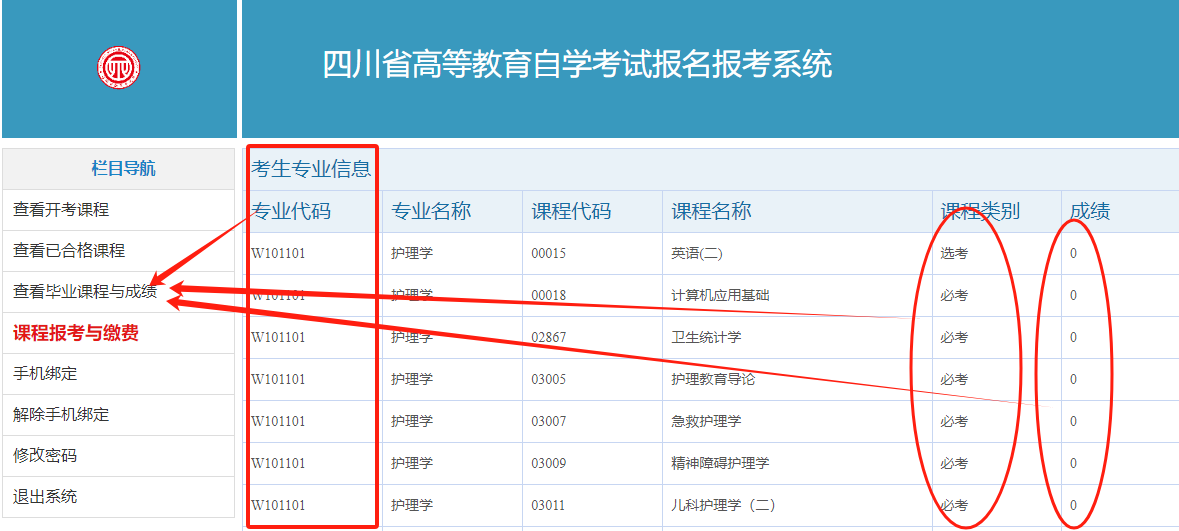3.查看毕业课程与成绩。点击左边菜单栏“查看毕业课程与成绩”,可以查看本专业下的课程及已获得的成绩。
