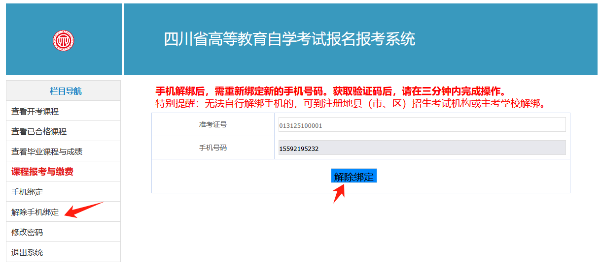 点击左侧菜单栏“解除手机绑定”可解绑手机。