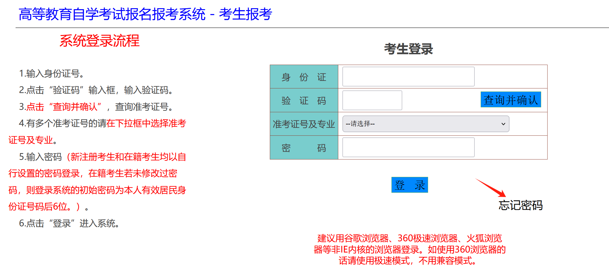 1.选择要报考的准考证后,输入密码,点击“登录”进入系统。新注册考生和在籍考生均以自行设置的密码登录,在籍考生若未修改过密码,则登录系统的初始密码为本人有效居民身份证号码后6位。