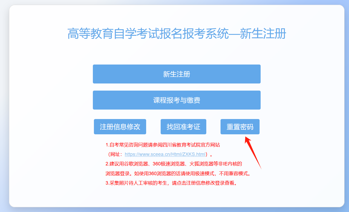自学考试网上新生注册及课程报考系统(以下简称系统)网址为:https://zk.sceea.cn/)。