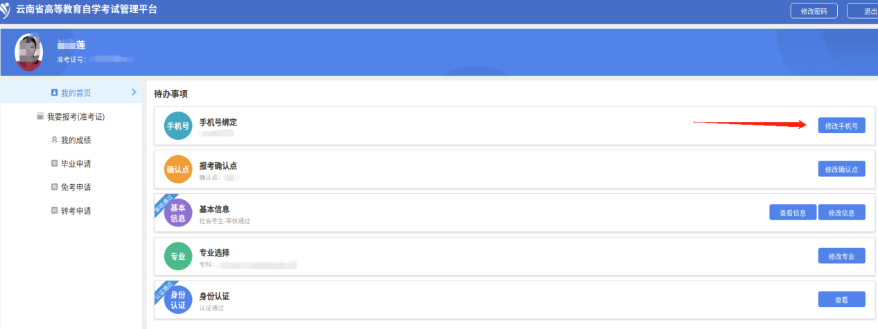 考生首次进入新系统后,需要点击“我的首页”填写代办事项内容,完善后方可进行报考、免考、转考、毕业申请等其他操作。