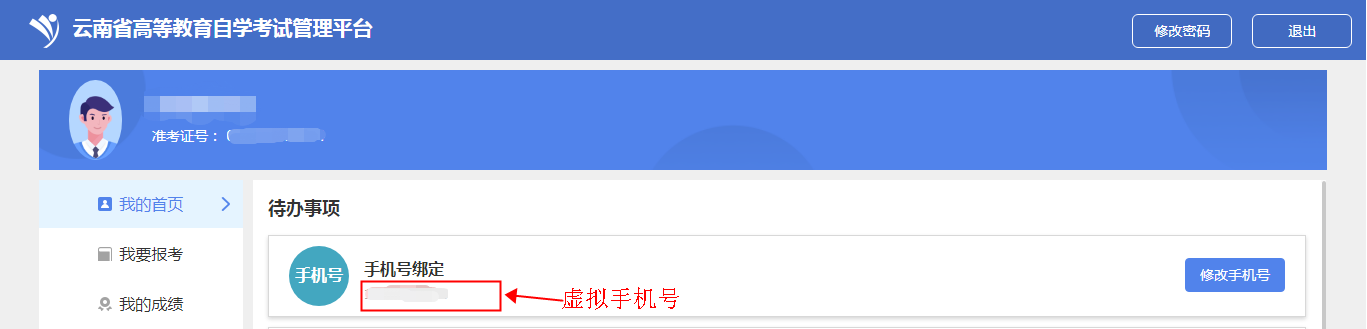 2.特殊考生登录后,如考生有手机号的,需要绑定手机号,没有手机号的绑定手机号的位置显示系统生成的虚拟手机号。